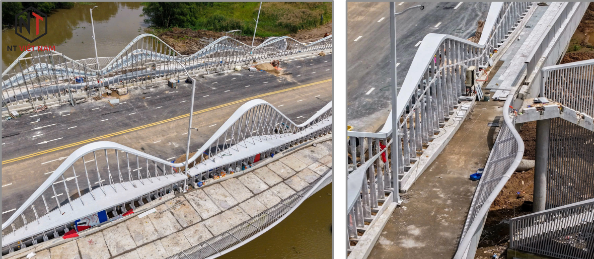 Công trình có 4 cầu thang cho khách bộ hành lên cầu, đã hoàn thiện. Lan can cầu bằng thép, thiết kế uốn lượn với đoạn cao nhất khoảng 3 m tạo điểm nhấn cho công trình. Các lối đi bộ ở hai bên thành cầu rộng khoảng 1,5 m được lát gạch.