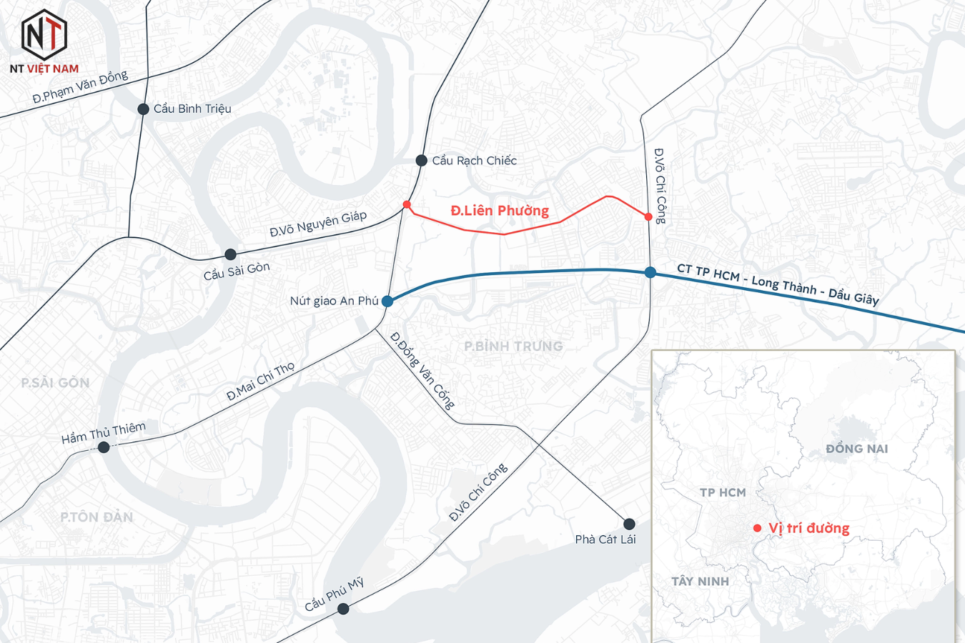 Đường Liên Phường dài 6,7 km, nối Nguyễn Duy Trinh với nút giao Cát Lái, được mở rộng 4-6 làn xe. Tuyến này giúp giảm tải cho nút giao An Phú cách đó hơn 5 km, rút ngắn thời gian xe từ cao tốc Long Thành về đại lộ Võ Nguyên Giáp và trung tâm TP HCM.