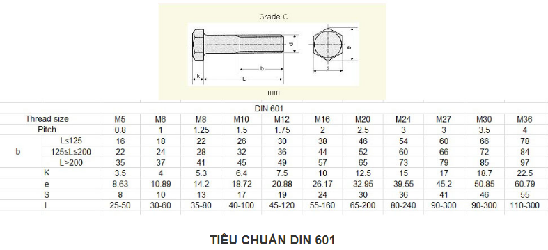 Chuẩn DIN 601 cho bu lông ren có một đoạn trơn