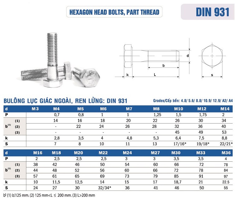 Bảng tra bulong ren có một đoạn trơn chuẩn DIN 931
