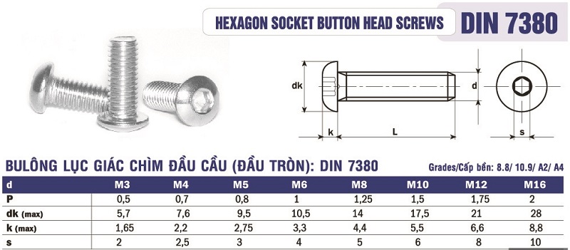Bảng tra bu lông, đai ốc lục giác chìm đầu MO chuẩn DIN 7380