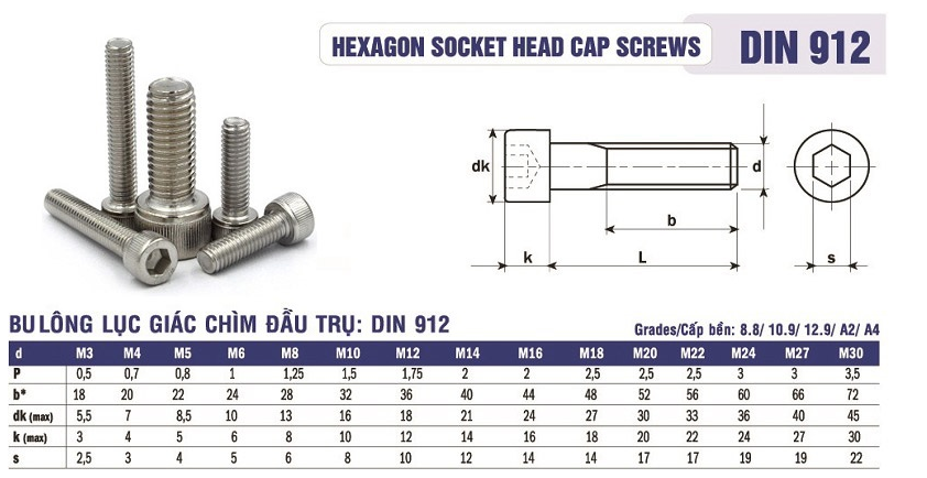 Bảng tra bu lông, đai ốc lục giác chìm chuẩn DIN 912